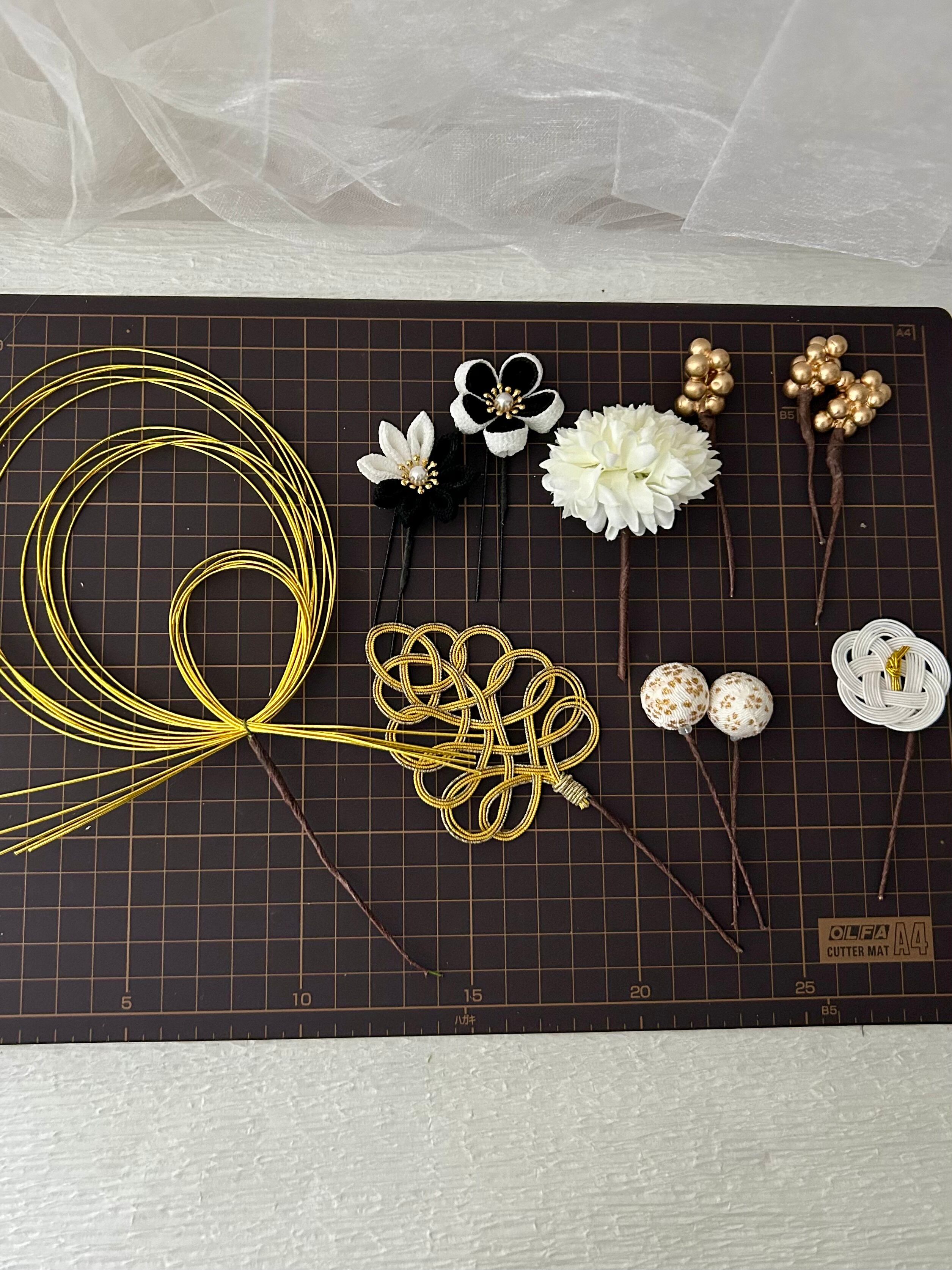 使用素材:アーティフィシャルフラワー、つまみ細工、水引他