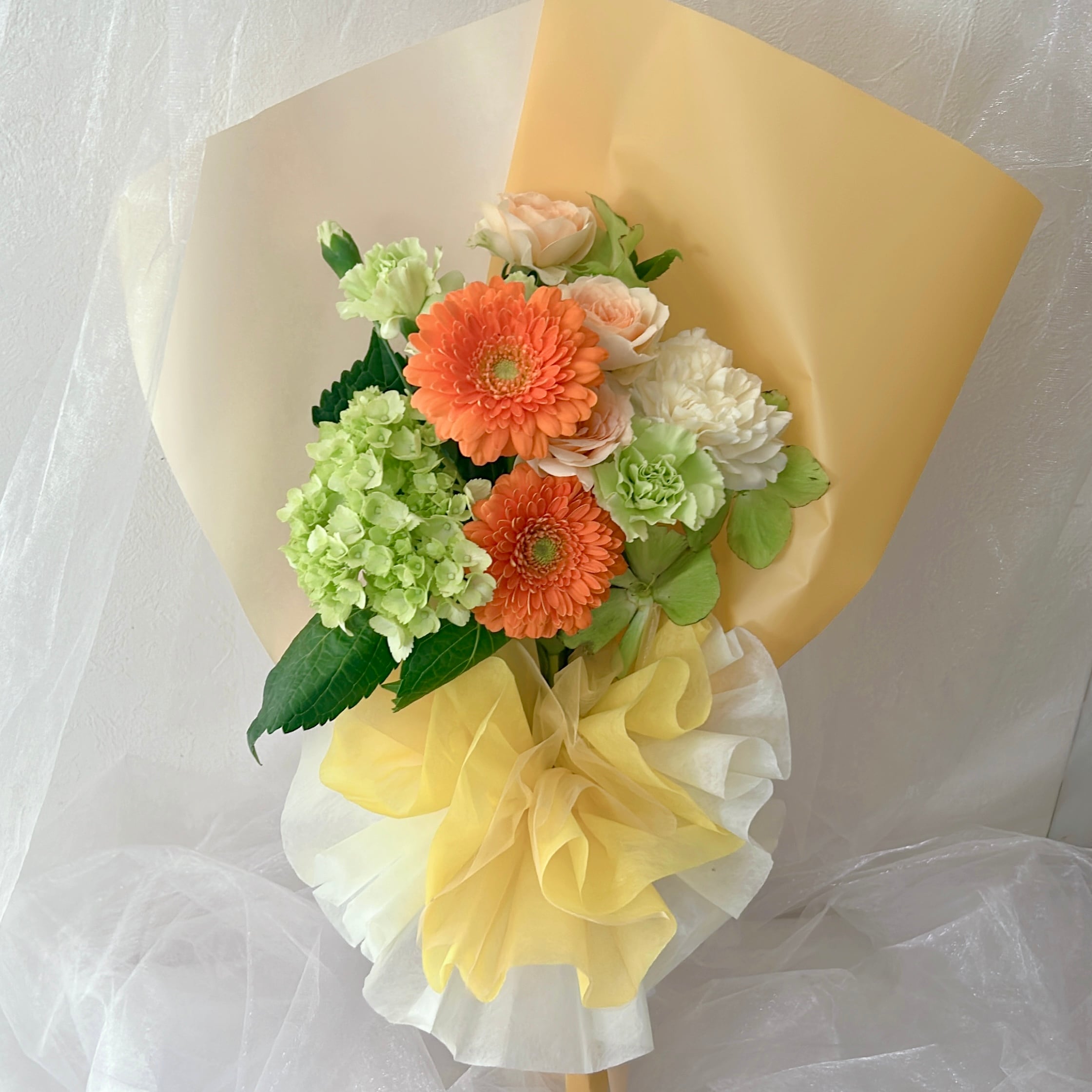 Croisオリジナルの母の日花束。鮮やかなオレンジとイエローの組み合わせが、明るく前向きな気分にしてくれます。