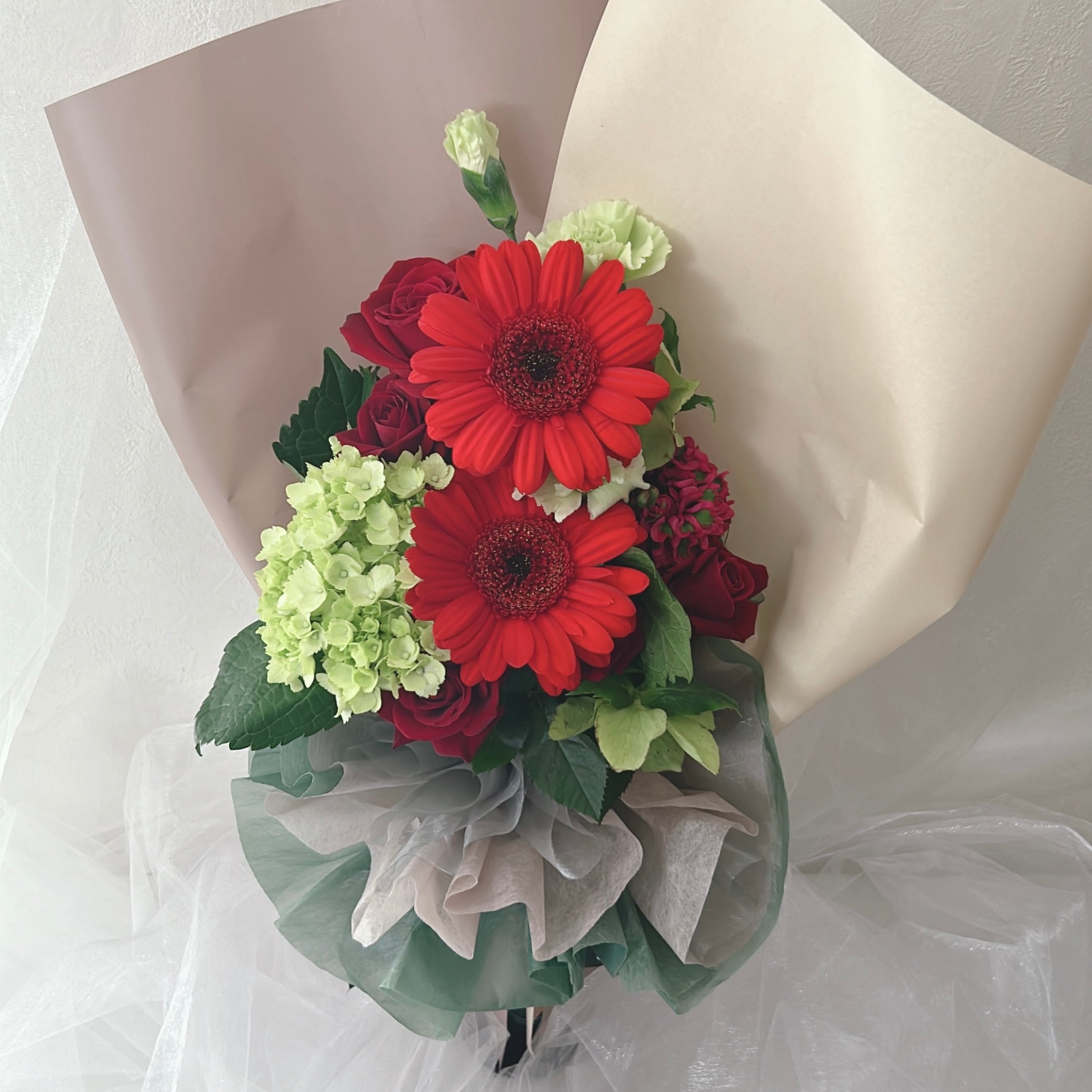 Croisオリジナルの母の日花束。情熱的なレッドが華やかな存在感を放ちます。